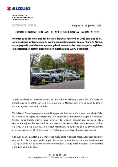 Pionnier et leader historique des kei-cars, Suzuki a conservé en 2025 son rang de n°1 sur ce segment emblématique du marché automobile nippon. Depuis 70 ans, la Marque accompagne le quotidien des Japonais grâce à ces véhicules ultra-compacts, ingénieux et accessibles, et bientôt disponibles en motorisations 100 % électriques.