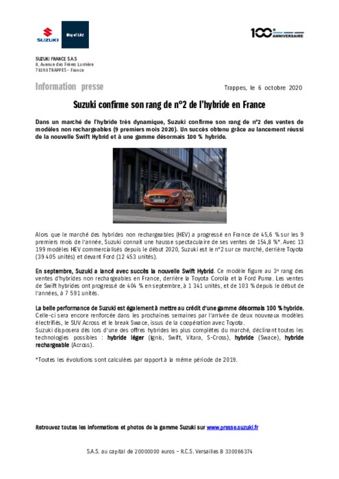 Alors que le marché des hybrides non rechargeables (HEV) a progressé en France de 45,6 % sur les 9 premiers mois de l’année, Suzuki connait une hausse spectaculaire de ses ventes de 154,8 %. Avec 13 199 modèles HEV commercialisés depuis le début 2020, Suzuki est le n°2 sur ce marché, derrière Toyota (39 405 unités) et devant Ford (12 453 unités).