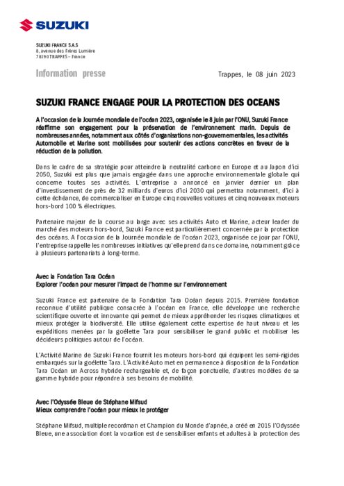 A l’occasion de la Journée mondiale de l’océan 2023, organisée le 8 juin par l’ONU, Suzuki France réaffirme son engagement pour la préservation de l’environnement marin. Depuis de nombreuses années, notamment aux côtés d’organisations non gouvernementales, les activités Automobile et Marine sont mobilisées pour soutenir des actions concrètes en faveur de la réduction de la pollution.