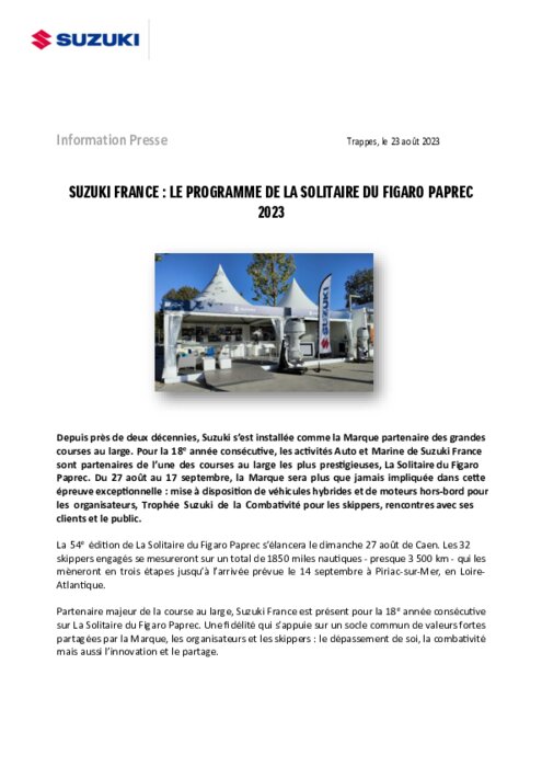 Depuis près de deux décennies, Suzuki s’est installée comme la Marque partenaire des grandes courses au large. Pour la 18e année consécutive, les activités Auto et Marine de Suzuki France sont partenaires de l’une des courses au large les plus prestigieuses, La Solitaire du Figaro Paprec. Du 27 août au 17 septembre, la Marque sera plus que jamais impliquée dans cette épreuve exceptionnelle : mise à disposition de véhicules hybrides et de moteurs hors-bord pour les organisateurs, Trophée Suzuki de la Combativité pour les skippers, rencontres avec ses clients et le public