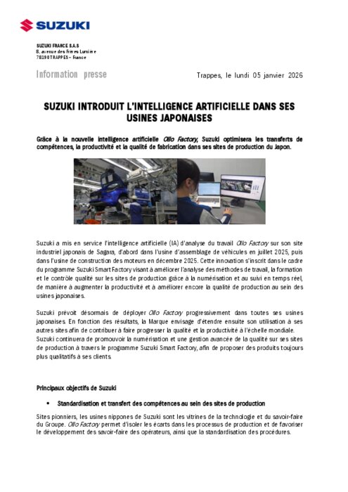 Suzuki a mis en service l'intelligence artificielle (IA) d'analyse du travail Ollo Factory sur son site industriel japonais de Sagara, d'abord dans l'usine d'assemblage de véhicules en juillet 2025, puis dans l'usine de construction des moteurs en décembre 2025. Cette innovation s'inscrit dans le cadre du programme Suzuki Smart Factory visant à améliorer l'analyse des méthodes de travail, la formation et le contrôle qualité sur les sites de production grâce à la numérisation et au suivi en temps réel, de manière à augmenter la productivité et à améliorer encore la qualité de production au sein des usines japonaises.