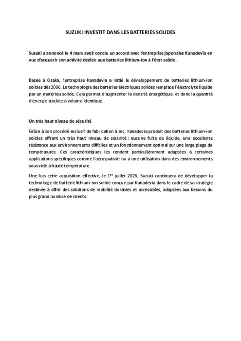 Basée à Osaka, l'entreprise Kanadevia a initié le développement de batteries lithium-ion solides dès 2006. La technologie des batteries électriques solides remplace l'électrolyte liquide par un matériau solide. Cela permet d'augmenter la densité énergétique, et donc la quantité d'énergie stockée à volume identique.