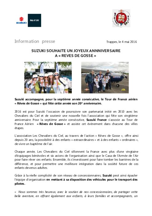 2016 est pour Suzuki l’occasion de poursuivre son partenariat initié en 2010 avec les Chevaliers du Ciel et de soutenir une nouvelle fois l’association qui fête son vingtième anniversaire. Pour la septième année consécutive, Suzuki France s’associe au Tour de France Aérien « Rêves de Gosse » et assiste cet événement dans chacune des villes étapes.