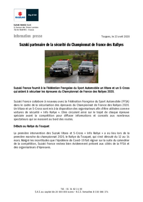 Suzuki France collabore à nouveau avec la Fédération Française du Sport Automobile (FFSA) dans le cadre de la sécurisation des épreuves du Championnat de France des Rallyes 2020. Un Vitara et un S-Cross sont mis à la disposition des organisateurs afin d’être utilisées comme voitures de sécurité " Info Rallye ". Elles circulent ainsi sur le trajet de chaque épreuve spéciale avant la compétition pour diffuser informations et conseils aux nombreux spectateurs qui se massent au bord des routes.
