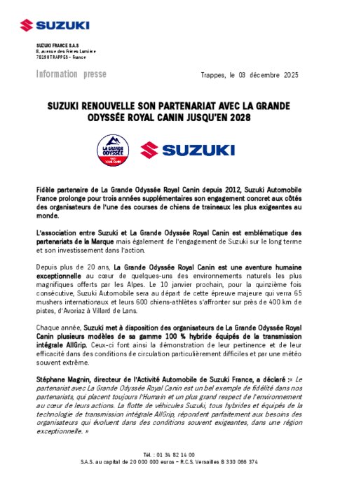 Fidèle partenaire de La Grande Odyssée Royal Canin depuis 2012, Suzuki Automobile France prolonge pour trois années supplémentaires son engagement concret aux côtés des organisateurs de l'une des courses de chiens de traineaux les plus exigeantes au monde.