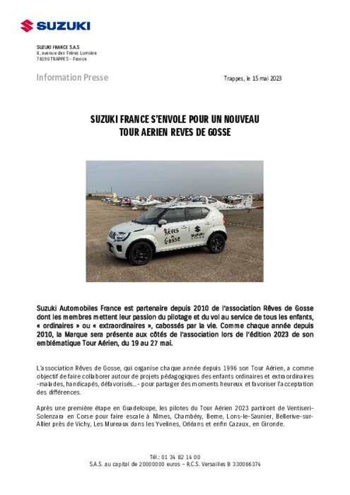 Suzuki Automobiles France est partenaire depuis 2010 de l’association Rêves de Gosse dont les membres mettent leur passion du pilotage et du vol au service de tous les enfants, "ordinaires" ou "extraordinaires", cabossés par la vie. Comme chaque année depuis 2010, la marque sera présente aux côtés de l’association lors de l’édition 2023 de son emblématique Tour Aérien, du 19 au 27 mai.