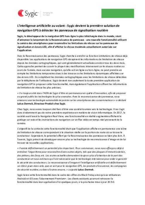 Sygic, le développeur de la navigation GPS hors-ligne la plus téléchargée dans le monde, vient d’annoncer le lancement de la Reconnaissance de panneaux - une nouvelle fonctionnalité utilisant la caméra des smartphones pour reconnaître les limitations de vitesse sur les panneaux de signalisation et écrans LED, afin d’afficher la vitesse maximale actuellement autorisée sur l’application.