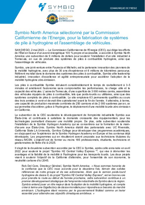 La Commission Californienne de l'Energie (CEC), qui dirige les efforts de l'État en faveur d'un avenir énergétique 100 % propre et accessible, a accordé à Symbio North America une subvention de 9 millions de dollars pour soutenir l’installation d’un site industriel à Temecula, en vue de produire des systèmes de piles à combustible hydrogène, ainsi que l’assemblage de véhicules.