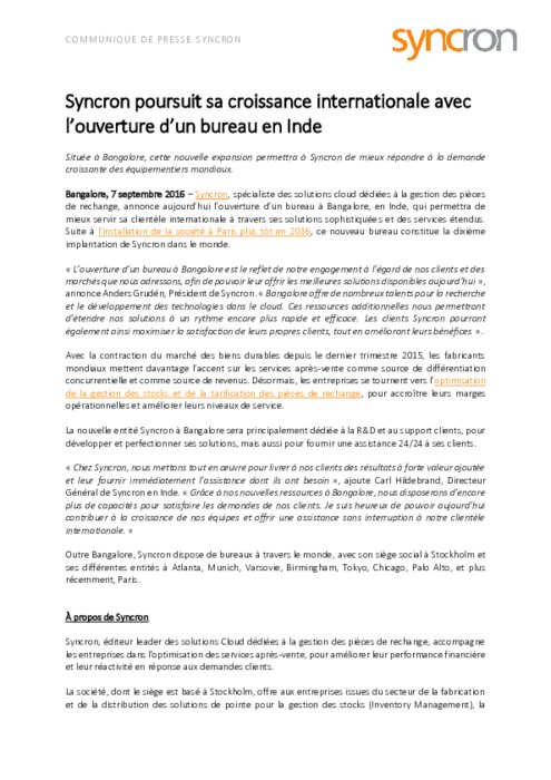 Syncron, spécialiste des solutions cloud dédiées à la gestion des pièces de rechange, annonce l’ouverture d’un bureau à Bangalore, en Inde, qui permettra de mieux servir sa clientèle internationale à travers ses solutions sophistiquées et des services étendus. Suite à l’installation de la société à Paris plus tôt en 2016, ce nouveau bureau constitue la dixième implantation de Syncron dans le monde.