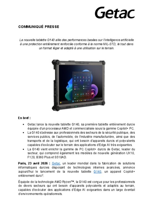 Equipementiers 23 avril 2026 - 12:04 Getac, un leader mondial dans la fabrication de solutions informatiques durcies disposant de technologies internes avancées, annonce le lancement de la nouvelle tablette G140, un appareil Copilot+ entièrement durci. PDF (703 Ko) Télécharger Crédit photo : GETAC