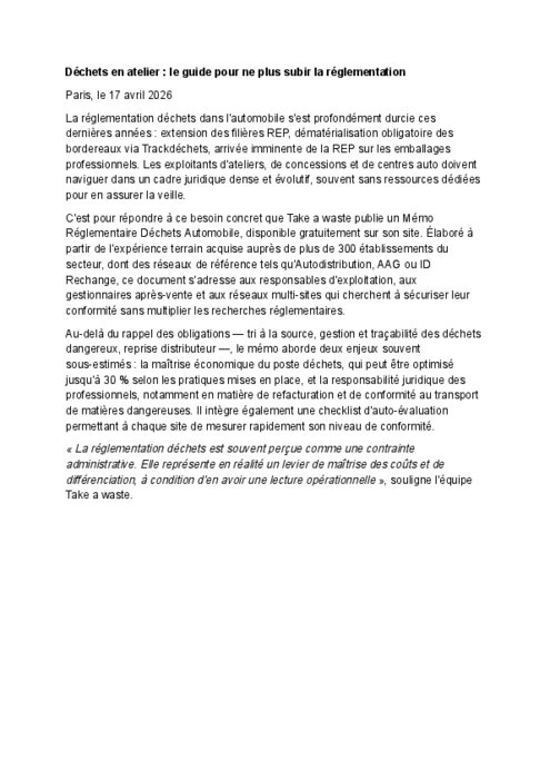 Take a waste publie un mémo réglementaire déchets spécifique au secteur automobile, élaboré à partir de l'accompagnement de plus de 300 établissements — dont des réseaux comme Autodistribution, AAG ou ID Rechange. Le document fait le point sur les obligations applicables au secteur (Trackdéchets, filières REP, reprise distributeur...) et sur les enjeux économiques souvent sous-estimés du poste déchets.