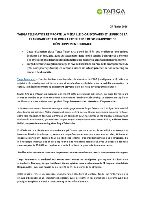 TargaTelematics– l’un des leaders mondiaux dans le domaine de l’AIoT(Intelligence artificielle des objets)et du développement de solutions et de plateformes digitale pour la mobilité connectée –a obtenu la médaille d'or dans le classement EcoVadis en matière de développement durable. Seules5 % des entreprises évaluées obtiennent cette prestigieuse distinction, qui exige les meilleurs scores en matière de performance durable au cours de l'année écoulée ainsi qu’un classement supérieur au 95e centile dans le classement général. Targa Telematics s’est classée au 97e percentile.