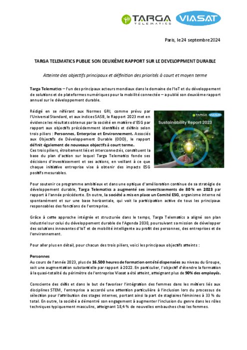 Rédigé en se référant aux Normes GRI, comme prévu par l'Universal Standard, et aux indices SASB, le Rapport 2023 met en évidence les résultats obtenus par la société en matière d’ESG par rapport aux objectifs précédemment identifiés et définis selon trois piliers : Personnes, Enterprise et Environnement. Associés aux Objectifs de Développement Durable (ODD), le rapport définit également de nouveaux objectifs à court terme. Ces trois piliers, étroitement liés et interconnectés, constituent la base du plan d'action sur lequel Targa Telematics fonde ses décisions d'investissement et ses actions, en veillant à ce que chaque initiative entreprise vise à obtenir des impacts ESG positifs mesurables.