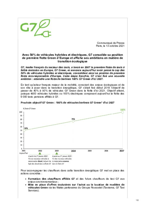 G7 souligne que cet engagement ne concerne pas ses flottes de monospaces et de véhicules équipés en rampe d'accès pour les personnes à mobilité réduite "en l'absence, à date, d'offres constructeurs en modèles monospaces à motorisation électrique avec une autonomie suffisante".