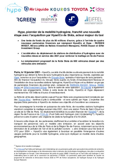 "La flotte de 600 véhicules diesel opérée aujourd'hui par Slota sera progressivement remplacée par des Toyota Mirai - berlines à pile à combustible - et sera opérée par Hype", précise le groupe dans un communiqué.