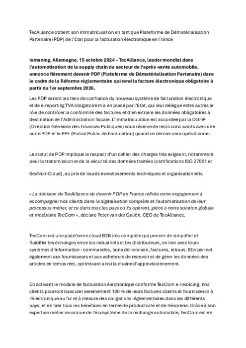 Les Plateforme de Dématérialisation Partenaire seront les tiers de confiance du nouveau système de facturation électronique et de e-reporting TVA obligatoire mis en place par l’Etat, qui leur délègue entre autres le rôle de contrôler la conformité des factures et d’en extraire les données obligatoires à destination de l’Administration fiscale. L’immatriculation est accordée par la DGFiP (Direction Générale des Finances Publiques) sous réserve de tests concluants avec une autre PDP et le PPF (Portail Public de Facturation) quand ce dernier sera opérationnel.
