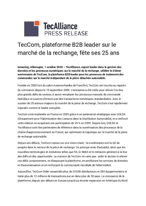 Fondée en 2000 lors du salon Automechanika de Francfort, TecCom est inscrite au registre du commerce depuis le 19 septembre 2000. L'entreprise a été créée pour relever l'un des plus grands défis du secteur, à savoir remplacer les processus manuels de commande fastidieux et sources d'erreurs par des transactions numériques standardisées. Avec le soutien de 20 acteurs majeurs du marché de la pièce de rechange, TecCom s'est rapidement imposée comme le leader européen.