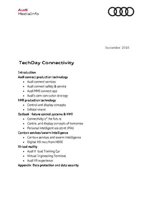 La connectivité et le networking font parties des clés du futur de l’automobile. Audi, un des leaders dans ces domaines, continue d’affirmer sa position avec le premier service car-to-x produit grâce à Audi connect, de nouveaux modules d’Infotainment ou encore le système de cartographie de haute-précision de l’entreprise "HERE" conçu spécialement pour la conduite autonome. Dans un futur de plus en plus proche, les clients Audi profiteront d’encore plus de confort, de sécurité et d’efficacité...