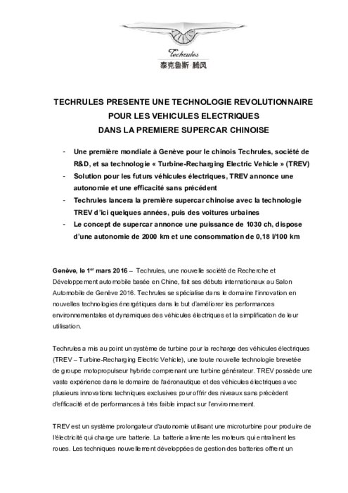 Techrules, une nouvelle société de Recherche et Développement automobile basée en Chine, fait ses débuts internationaux au Salon Automobile de Genève 2016. Techrules se spécialise dans le domaine l'innovation en nouvelles technologies énergétiques dans le but d’améliorer les performances environnementales et dynamiques des véhicules électriques et la simplification de leur utilisation.