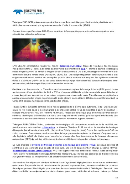 Certifiée pour l'automobile, la Tura dispose d'un nouveau capteur infrarouge lointain (FIR) passif haute performance, d'une résolution de 640 × 512 et d'une sensibilité de pointe, essentielle pour détecter et classer les piétons, les animaux et les autres usagers vulnérables de la route. Elle offre une perception bien supérieure à celle des phares dans l'obscurité totale et dans les conditions difficiles que sont le brouillard, la fumée et l'éblouissement causé par le soleil ou les phares.