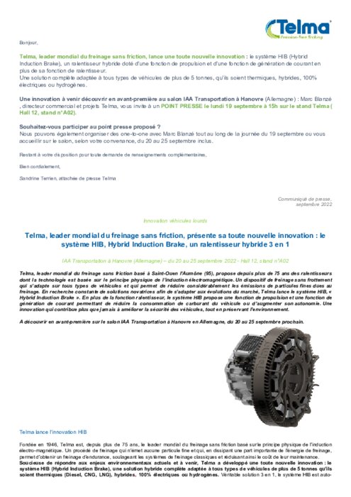 Telma, leader mondial du freinage sans friction basé à Saint-Ouen l’Aumône (95), propose depuis plus de 75 ans des ralentisseurs dont la technologie est basée sur le principe physique de l’induction électromagnétique. Un dispositif de freinage sans frottement qui s’adapte sur tous types de véhicules et qui permet de réduire considérablement les émissions de particules fines dues au freinage.