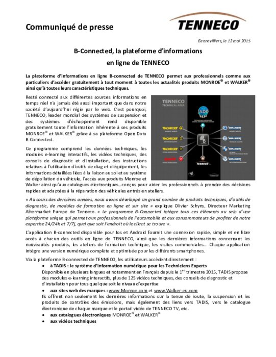Equipementiers 12 mai 2015 - 15:04 La plateforme d’informations en ligne B-connected de TENNECO permet aux professionnels comme aux particuliers d’accéder gratuitement à tout moment à toutes les actualités produits MONROE et WALKER ainsi qu’à toutes leurs caractéristiques techniques. PDF (658 Ko) Télécharger