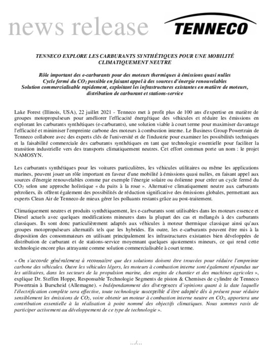 Tenneco met à profit plus de 100 ans d'expertise en matière de groupes motopropulseurs pour améliorer l'efficacité énergétique des véhicules et réduire les émissions en explorant les carburants synthétiques (e-carburants), une solution viable à court terme pour maximiser l'efficacité et minimiser l'empreinte carbone des moteurs à combustion interne.