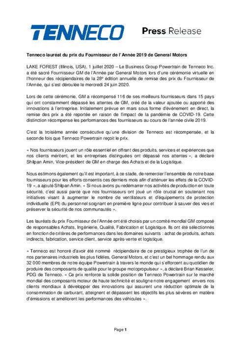 Le Business Group Powertrain de Tenneco. a été sacré Fournisseur GM de l’Année par General Motors lors d’une cérémonie virtuelle en l’honneur des récipiendaires de la 28e édition de remise des prix du Fournisseur de l’Année, qui s’est déroulée le 24 juin dernier. C’est la troisième année consécutive qu’une division de Tenneco est récompensée, et la seconde fois que Tenneco Powertrain reçoit le prix.