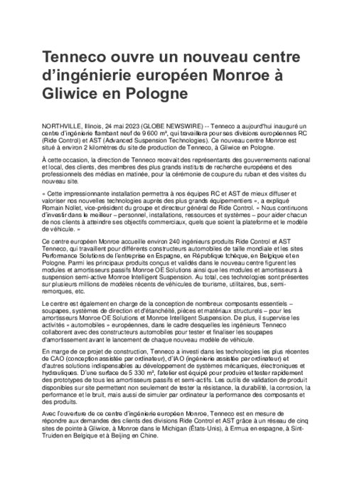 Tenneco ouvre un nouveau centre d’ingénierie européen Monroe à Gliwice en Pologne