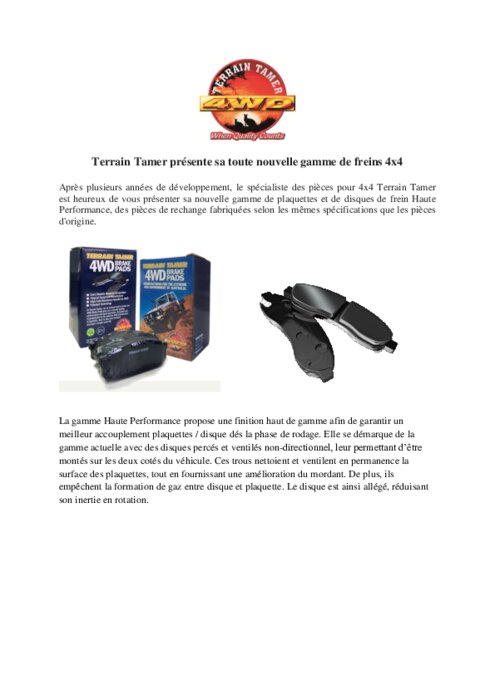 Après plusieurs années de développement, le spécialiste des pièces pour 4x4 Terrain Tamer présente sa nouvelle gamme de plaquettes et de disques de frein Haute Performance, fabriquée selon les mêmes spécifications que les pièces d'origine.