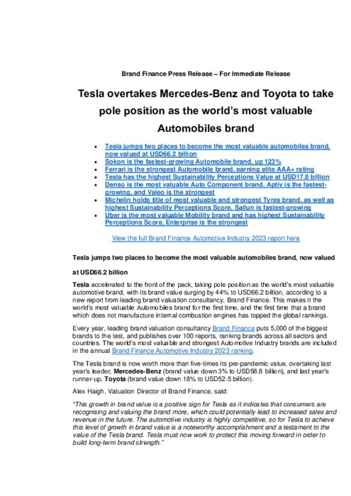 Tesla s'est hissée en tête du peloton, prenant la pole position en tant que marque automobile la plus valorisée au monde, avec une valeur de marque en hausse de 44 % à 66,2 milliards de dollars, selon un nouveau rapport du principal cabinet de conseil en évaluation de marque, Brand Finance.