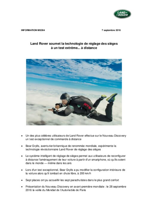 Bear Grylls, aventurier britannique de renommée mondiale et célèbre utilisateur de Land Rover, est allé dans les airs pour soumettre à un test incroyable la technologie de réglage intelligent des sièges du Nouveau Discovery. Ce système permet aux propriétaires du Nouveau Discovery de configurer avec leur smartphone le réglage des sièges de leur véhicule, où qu'ils soient dans le monde, grâce à l'application InControl Remote.