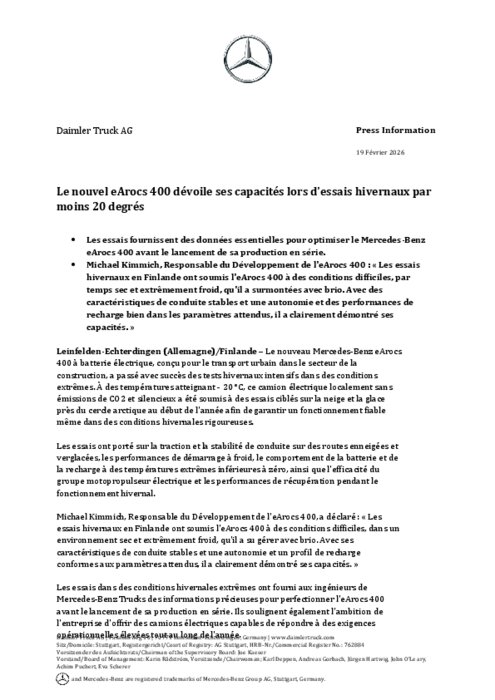 Le nouveau Mercedes-Benz eArocs 400 à batterie électrique, conçu pour le transport urbain dans le secteur de la construction, a passé avec succès des tests hivernaux intensifs dans des conditions extrêmes. À des températures atteignant - 20 °C, ce camion électrique localement sans émissions de CO2 et silencieux a été soumis à des essais ciblés sur la neige et la glace près du cercle arctique au début de l'année afin de garantir un fonctionnement fiable même dans des conditions hivernales rigoureuses.