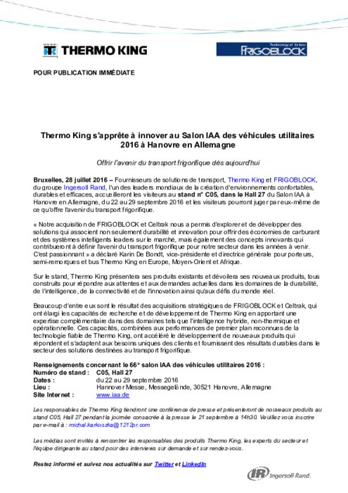Fournisseurs de solutions de transport, Thermo King et FRIGOBLOCK, du groupe Ingersoll Rand, l'un des leaders mondiaux de la création d'environnements confortables, durables et efficaces, accueilleront les visiteurs au stand n° C05, dans le Hall 27 du Salon IAA à Hanovre en Allemagne, du 22 au 29 septembre 2016 et les visiteurs pourront juger par eux-même de ce qu'offre l'avenir du transport frigorifique.