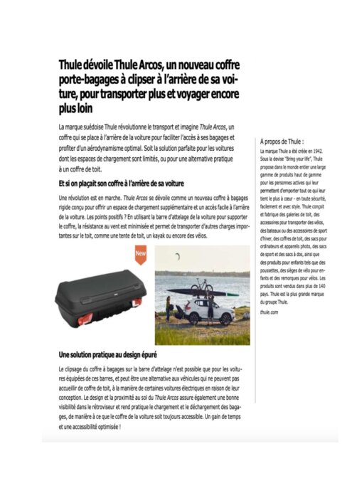 Equipementiers 10 février 2023 - 11:58 Thule dévoile Thule Arcos, un nouveau coffre porte-bagages à clipser à l'arrière de sa voiture, pour transporter plus et voyager encore plus loin. PDF (360 Ko) Télécharger
