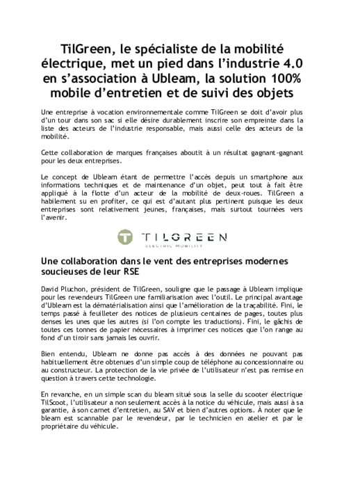 TilGreen commercialise ses véhicules à son réseau de revendeurs, qui s’occupent du Service Après-Vente. Un partenariat comme celui avec Ubleam est donc particulièrement pertinent puisqu’il permet de faire le lien encore plus facilement avec les concessionnaires, d’apporter des mises à jour en direct aux services proposés et de mieux comprendre l’utilisation des véhicules. Le gain de temps est considérable pour le constructeur, pour les ateliers, pour les revendeurs et aussi pour les utilisateurs