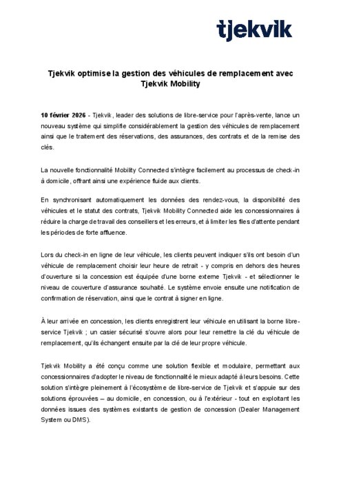 Tjekvik, leader des solutions de libre-service pour l’après-vente, lance un nouveau système qui simplifie considérablement la gestion des véhicules de remplacement ainsi que le traitement des réservations, des assurances, des contrats et de la remise des clés.
