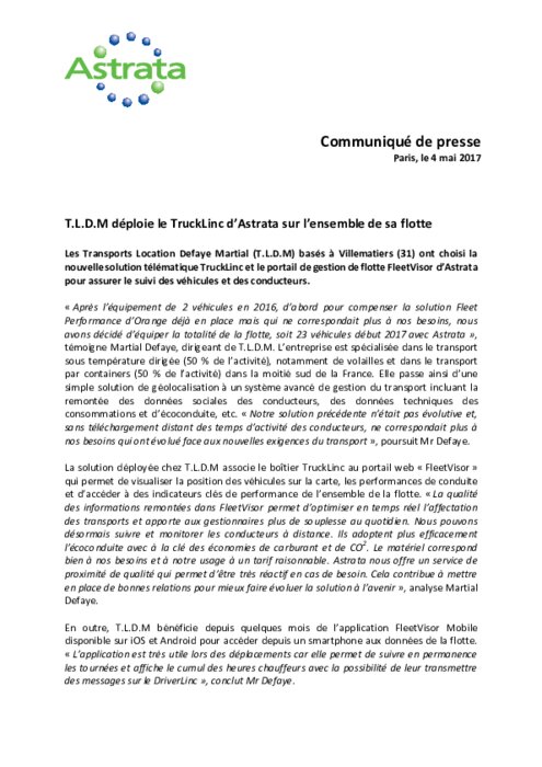 Services 04 mai 2017 - 11:14 Les Transports Location Defaye Martial (T.L.D.M) basés à Villematiers ont choisi la nouvelle solution télématique TruckLinc et le portail de gestion de flotte FleetVisor d'Astrata pour assurer le suivi des véhicules et des conducteurs. PDF (90 Ko) Télécharger