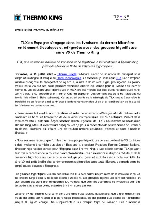 Thermo King®, fabricant leader de solutions de transport sous température dirigée et marque de Trane Technologies, a annoncé aujourd'hui que TLX, une entreprise familiale espagnole de transport et de logistique, a installé de nouveaux groupes frigorifiques poulie-moteur série VX sur ses deux premiers véhicules électriques utilisés pour la livraison du dernier kilomètre. Les deux groupes frigorifiques V-400X ont été montés sur des fourgons électriques MAN par Frigicoll.