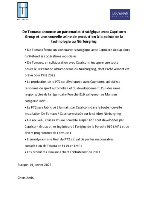 De Tomaso forme un partenariat stratégique avec Capricorn Group alors qu'il étend ses opérations mondiales. De Tomaso, en collaboration avec Capricorn, inaugure une toute nouvelle installation ultramoderne du Nürburgring, dont l'achèvement est prévu pour l'été 2022.