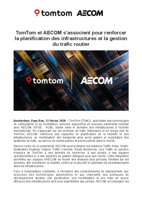 TomTom (TOM2), spécialiste des technologies de cartographie et de localisation, annonce aujourd’hui un nouveau partenariat mondial avec AECOM (NYSE : ACM), leader dans le domaine des infrastructures à l’échelle internationale. En s’appuyant sur les données de trafic historiques et en temps réel de TomTom, AECOM renforcera ses capacités en planification de la mobilité et des infrastructures, en modélisation des transports ainsi qu’en gestion et exploitation des systèmes de trafic, au service de clients publics et privés partout dans le monde.