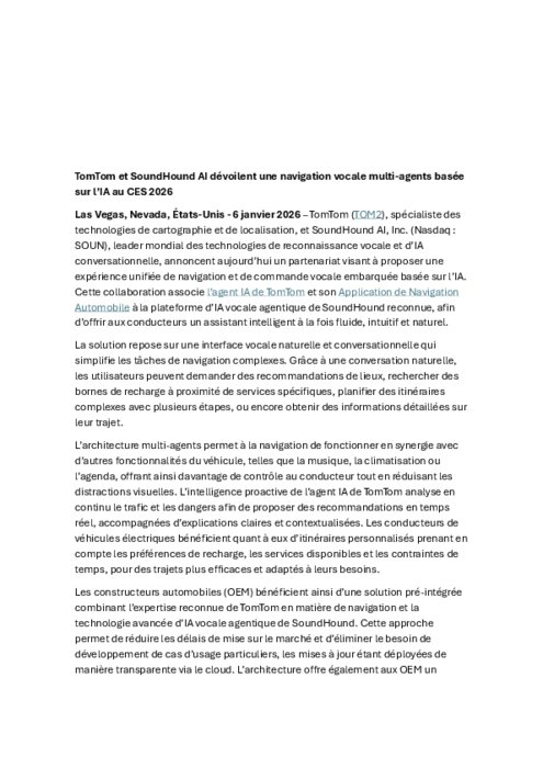TomTom (TOM2), spécialiste des technologies de cartographie et de localisation, et SoundHound AI, Inc. (Nasdaq : SOUN), leader mondial des technologies de reconnaissance vocale et d’IA conversationnelle, annoncent aujourd’hui un partenariat visant à proposer une expérience unifiée de navigation et de commande vocale embarquée basée sur l’IA. Cette collaboration associe l’agent IA de TomTom et son Application de Navigation Automobile à la plateforme d’IA vocale agentique de SoundHound reconnue, afin d’offrir aux conducteurs un assistant intelligent à la fois fluide, intuitif et naturel.