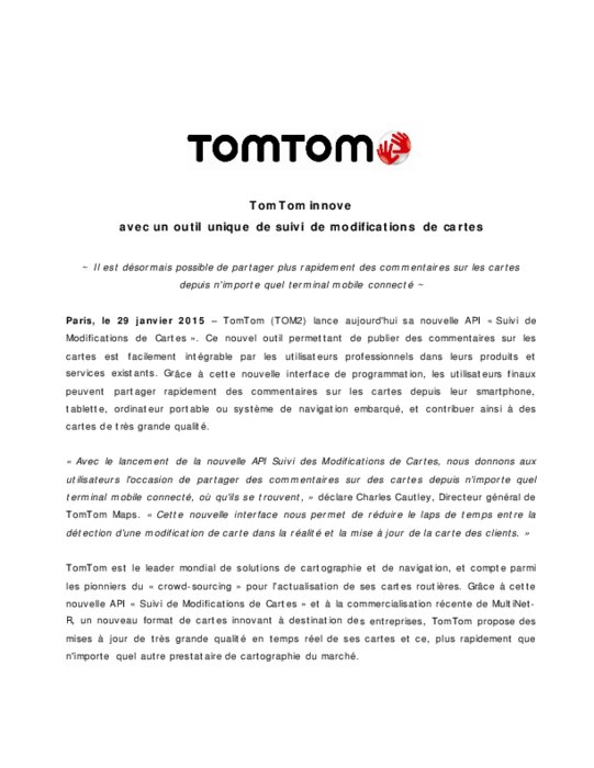 Paris, le 29 janvier 2015 – TomTom (TOM2) lance aujourd'hui sa nouvelle API « Suivi de Modifications de Cartes ». Ce nouvel outil permet tant de publier des commentaires sur les cartes est facilement intégrable par les utilisateurs professionnels dans leurs produits et services existants.