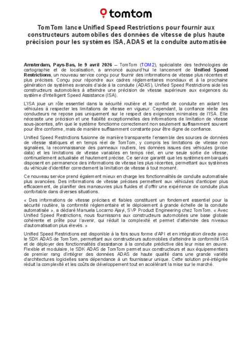 TomTom (TOM2), spécialiste des technologies de cartographie et de localisation, a annoncé aujourd’hui le lancement de Unified Speed Restrictions, un nouveau service conçu pour fournir des informations de vitesse plus récentes et plus précises. Conçu pour répondre aux cadres réglementaires mondiaux et à la prochaine génération de systèmes avancés d’aide à la conduite (ADAS), Unified Speed Restrictions aide les constructeurs automobiles à atteindre une précision de vitesse supérieure aux exigences du système d’Intelligent Speed Assistance (ISA).