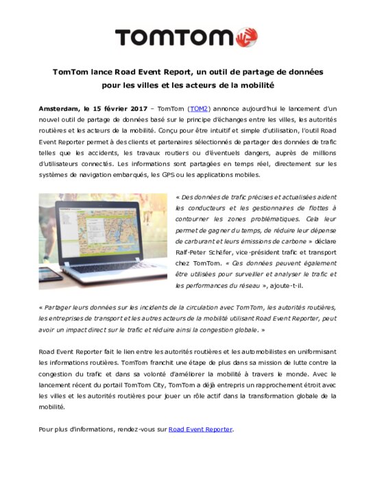 TomTom (TOM2) annonce le lancement d’un nouvel outil de partage de données basé sur le principe d’échanges entre les villes, les autorités routières et les acteurs de la mobilité. Conçu pour être intuitif et simple d’utilisation, l’outil Road Event Reporter permet à des clients et partenaires sélectionnés de partager des données de trafic telles que les accidents, les travaux routiers ou d’éventuels dangers, auprès de millions d’utilisateurs connectés.