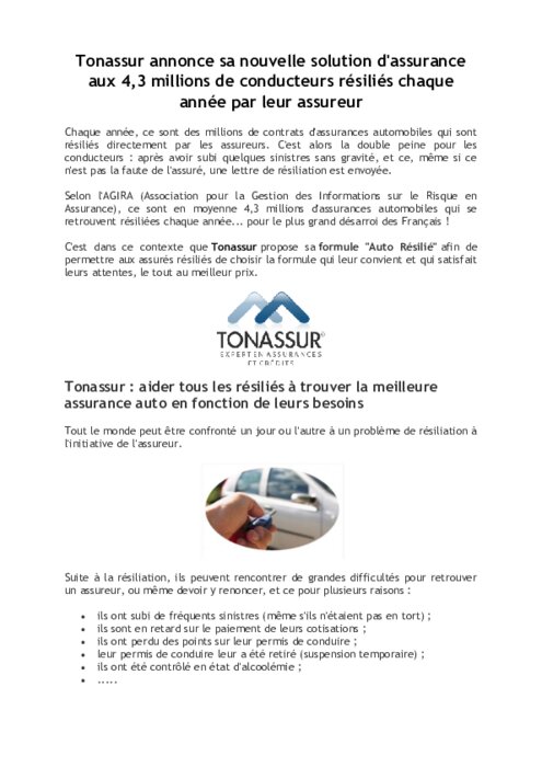 Selon l'AGIRA, ce sont en moyenne 4,3 millions d'assurances automobiles qui se retrouvent résiliées chaque année... C'est alors la double peine pour les conducteurs : après avoir subi quelques sinistres sans gravité, et ce, même si ce n'est pas la faute de l'assuré, une lettre de résiliation est envoyée. C'est dans ce contexte que Tonassur propose sa formule "Auto Résilié" afin de permettre aux assurés résiliés de choisir la formule qui leur convient et qui satisfait leurs attentes.