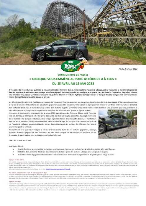 A l’occasion de l’ouverture au public de la nouvelle attraction Tonnerre 2 Zeus, le Parc Astérix s’associe à Ubeeqo, acteur majeur de la mobilité et spécialisé dans les locations de voiture en autopartage, pour faire gagner à Paris des journées ou un séjour pour quatre chez les Gaulois. L’opération, baptisée « Ubeeqo vous emmène de A à Zeus », mettra en circulation à partir du 25 avril 10 voitures hybrides rechargeables de la marque Hyundai Ioniq en libre-service.
