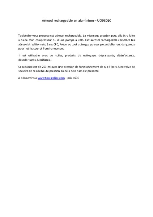 Toolatelier propose cet aérosol rechargeable. La mise sous pression peut-elle être faite à l’aide d’un compresseur ou d’une pompe à vélo. Cet aérosol rechargeable remplace les aérosols traditionnels. Sans CFC, Fréon ou tout autre gaz pulseur potentiellement dangereux pour l’utilisateur et l’environnement.