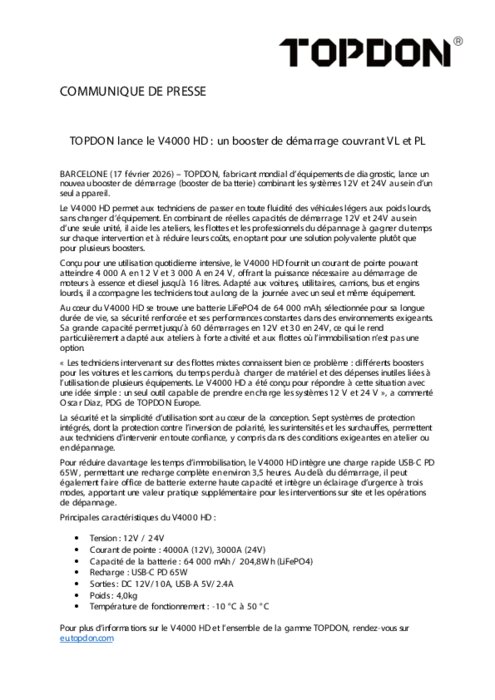 TOPDON lance le V4000 HD : un booster de démarrage couvrant VL et PL
