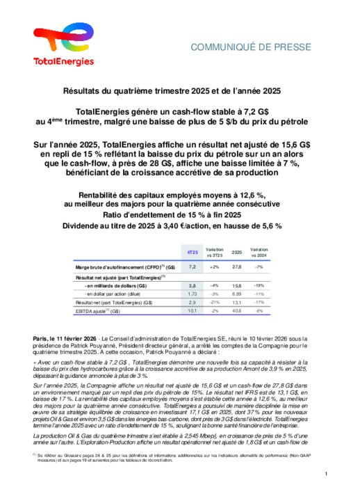 Sur l’année 2025, TotalEnergies affiche un résultat net ajusté de 15,6 G$ en repli de 15 % reflétant la baisse du prix du pétrole sur un an alors que le cash-flow, à près de 28 G$, affiche une baisse limitée à 7 %, bénéficiant de la croissance accrétive de sa production
